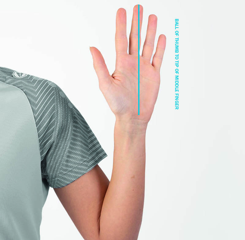 ВІД ПАЛЬЦЯ ДО КІНЧИКА СЕРЕДНЬОГО ПАЛЬЦЯ: Виміряйте від основи долоні до кінчика середнього пальця.